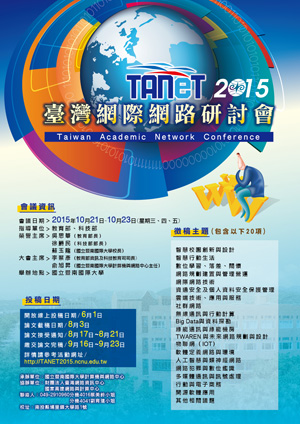 說明: 一、本研討會預定於104年10月21至23日假國立暨南國際大學舉行,歡迎各級學校教職員生依本屆大會所訂主題踴躍投稿,預定投稿截止日至8月3日止。相關資訊請參閱大會網站(http://tanet2015.ncnu.edu.tw)。 二、如有未盡事宜,請聯絡國立暨南國際大學蔡美鈴小姐(電話:049-2910960分機4016)。