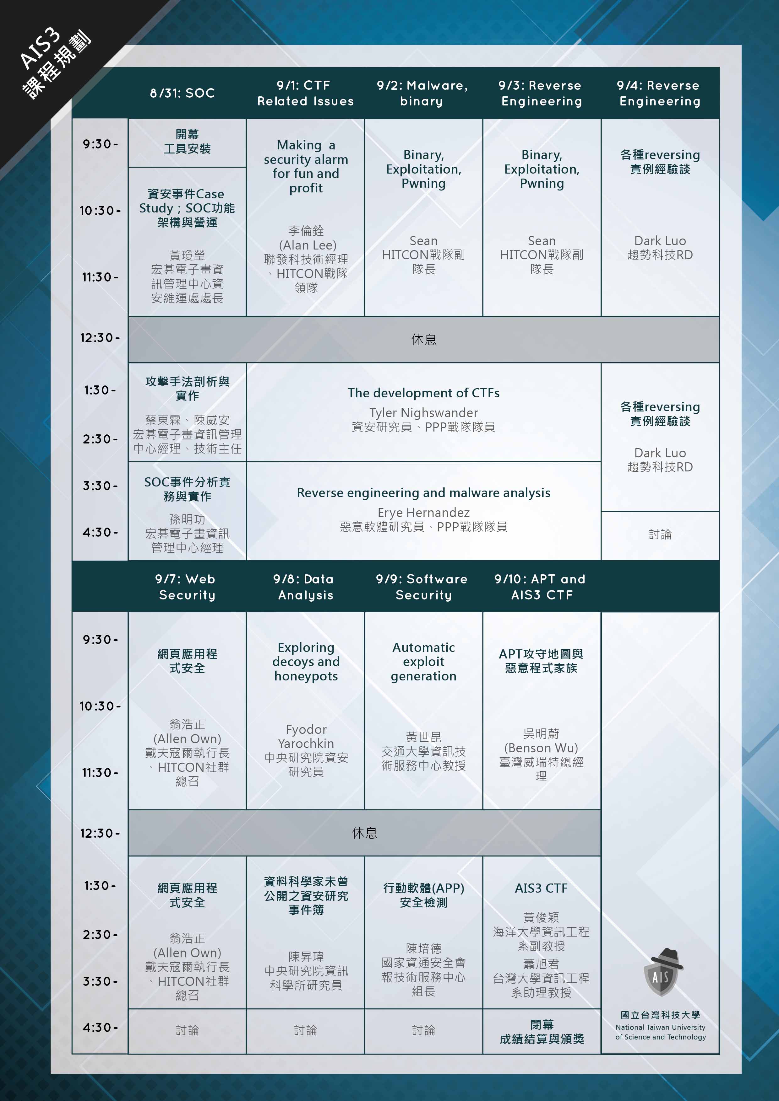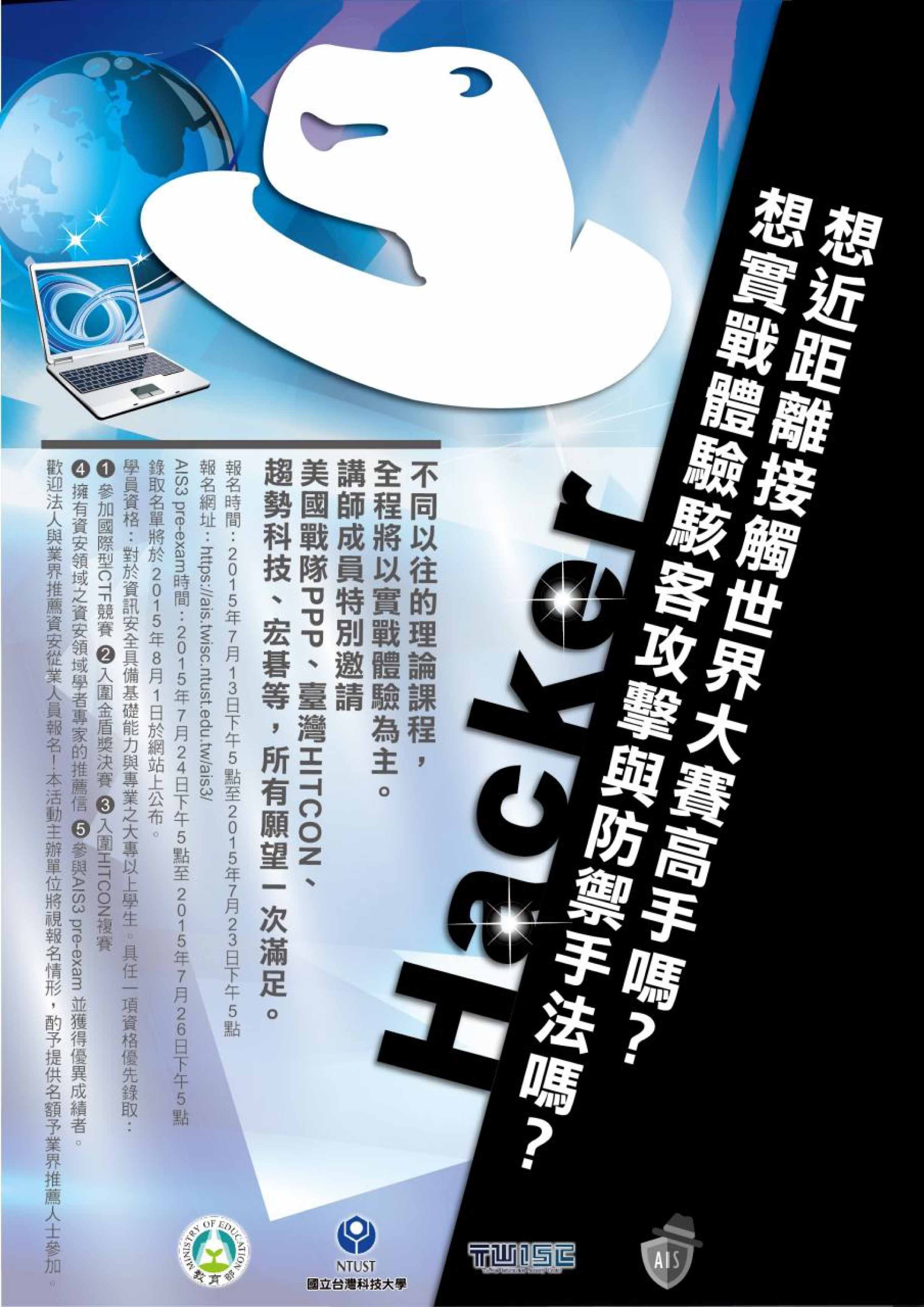 二、本活動報名時間為本年7月13日起至7月23日下午5時止。報名網址為:http://ais.twisc.ntust.edu.tw/ais3/。檢送活動及報名訊息如附件。